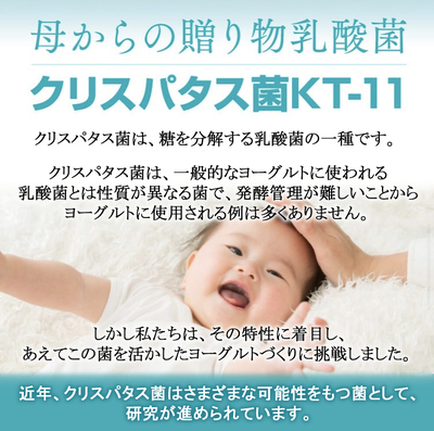 さらに、一般的なヨーグルトに使われる乳酸菌とは異なる乳酸菌「クリスパタス菌」を併せて配合しました。この菌の特性に着目し、その魅力を活かしたヨーグルトづくりに挑戦しています。原料には北海道産生乳を使用し、濃厚でクリーミーなギリシャ風ヨーグルトに仕上げました。