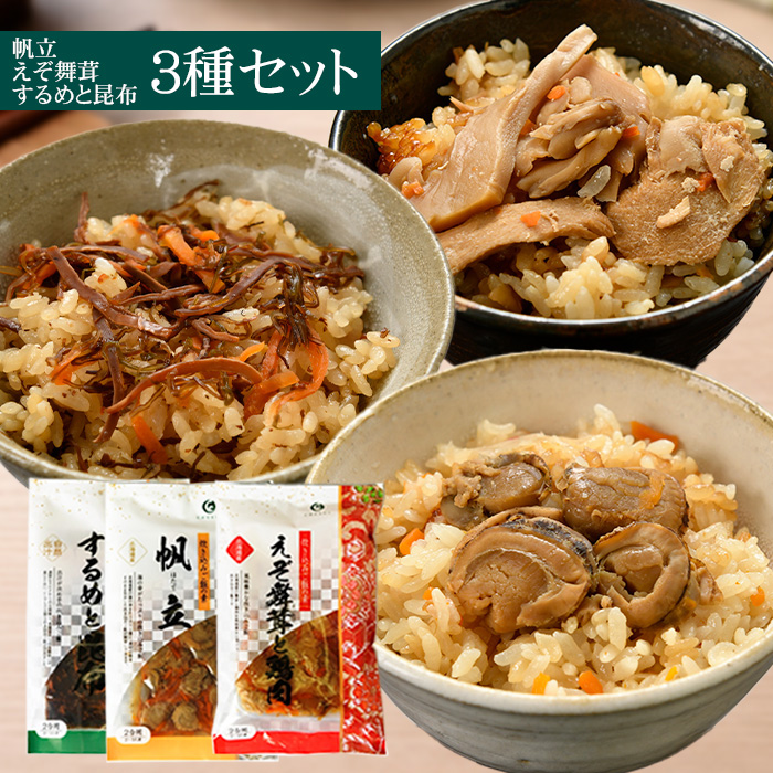 【帆立・えぞ舞茸・するめと昆布 炊き込みご飯の素3種】化学調味料・着色料・保存料不使用、ネコポス発送【送料込み】